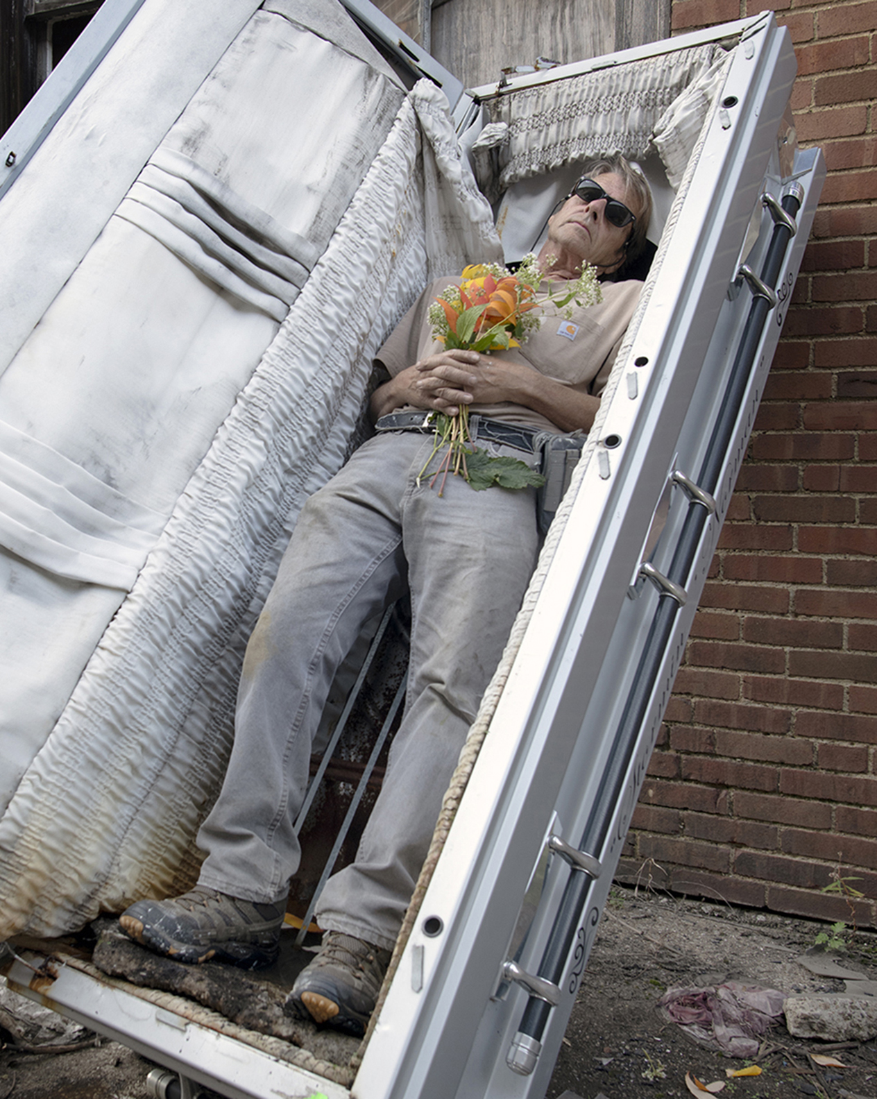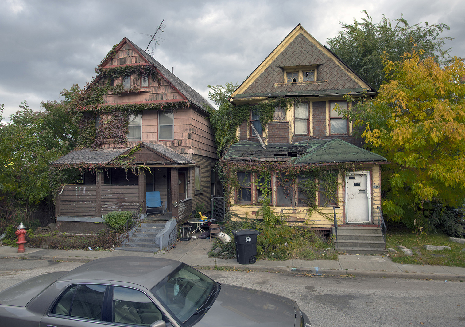 While shooting a three block-long road, Roxford, mostly bombed out and abandoned with four ocupied homes left, i was on my ladder shooting a large apartment building that was taken over by vines and trees, suddenly i heard this ghoul adressing me. It was Shirelle’s home-made ghoul on Roxford Road in East Cleveland. Her entire property features her creations including a very large wolf.
