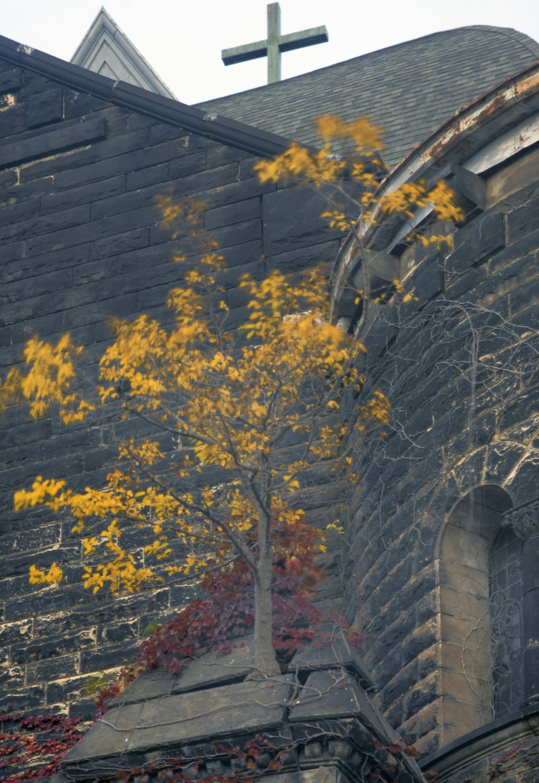 The peak fall color normally occurs at Halloween in this town, although every day is Halloween in the gothic, forest-covered city, that forgot about trimming, cutting and maintaining its flora, but not Halloween.