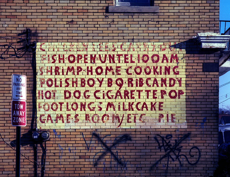 A menu painted on the side of a neighborhod deli around East 110th and Mount Carmel. The neighborhood began as a large Italian enclave and a long-gone classic amusement park called Luna Park, that was eventually demolished and replaced by housing projects. The deli, which had been there forever is gone, demolished in 2014.