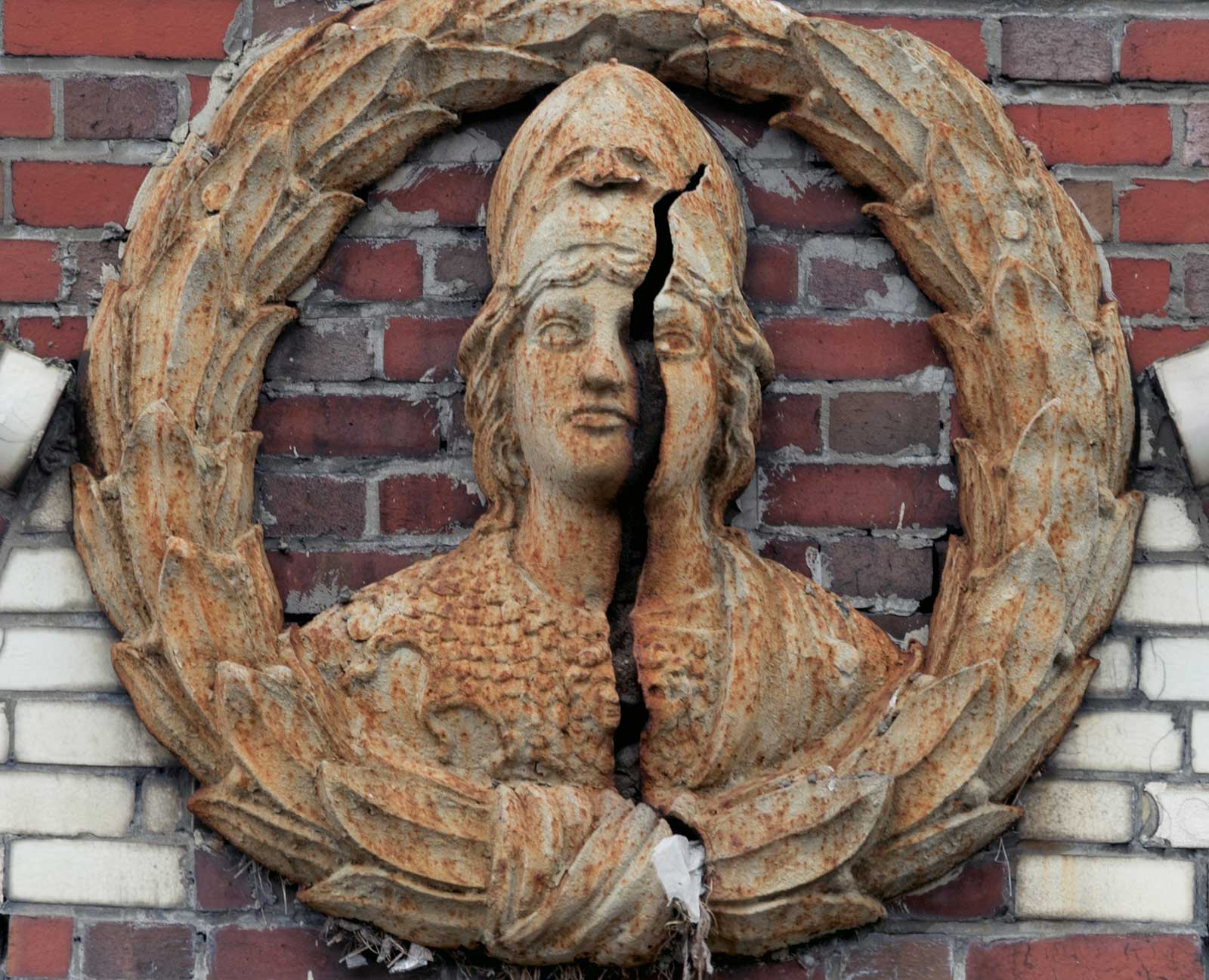 In the Tremont section of the Bronx, on Claremont Avenue, a collection of building ornamentations has one that has split open. It’s a plumbing supply warhouse now, and it was a bowling alley at one time.