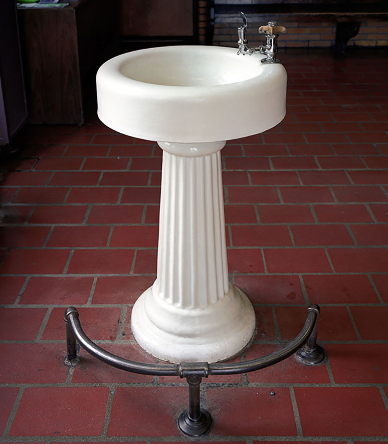 A drinking fountain at the Woodland Rec Center at East 855th & Woodland Avenue. Typical craft work from 100 years ago when craftsman, many Eurpoean, immigrated and provided bargain labor, which, for them, was an opportunity.