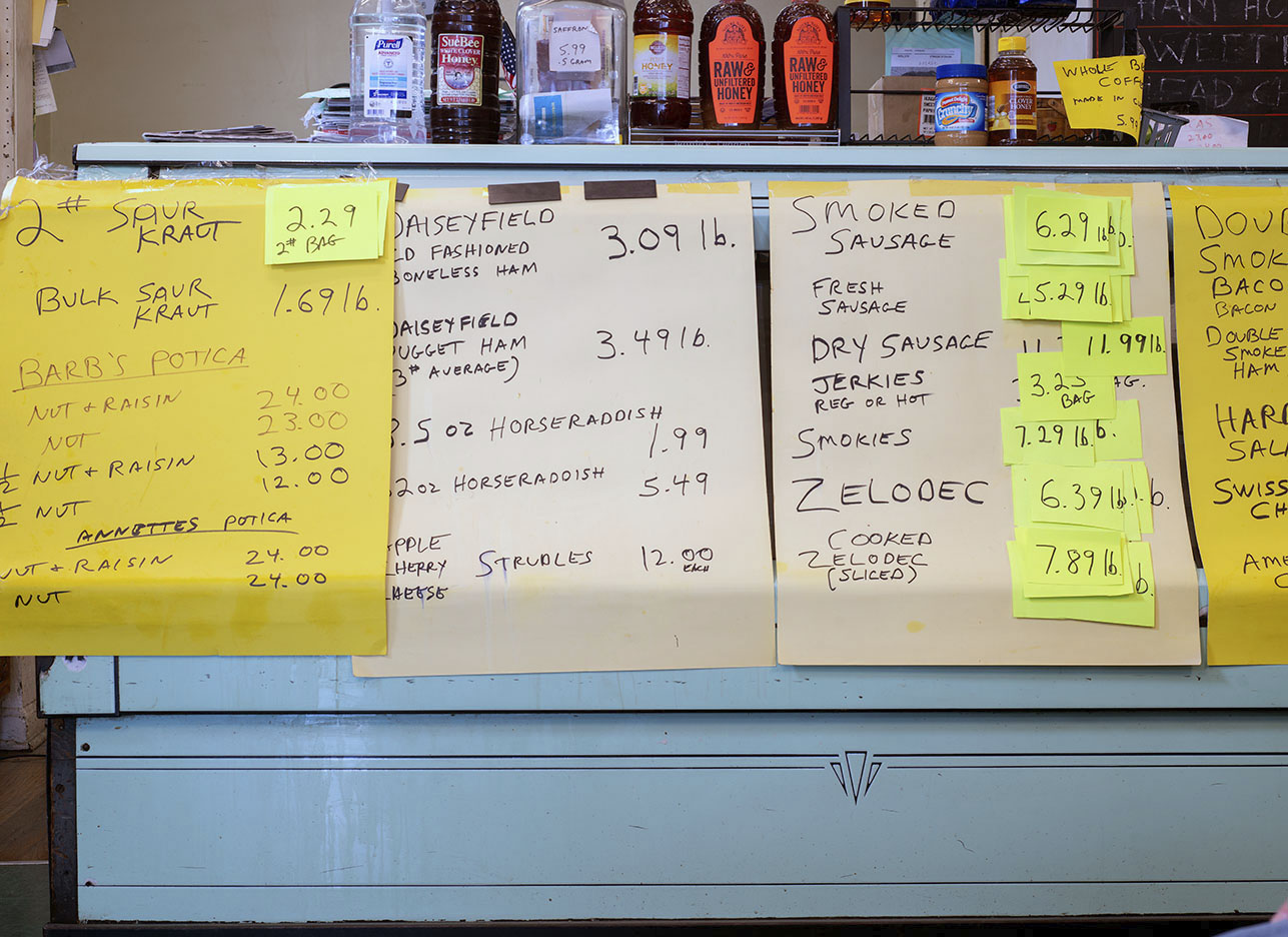 HIGH-TECH SIGNAGE Epigrams The Azman & Sons Meat Market displays the current prices on Slovenian products.