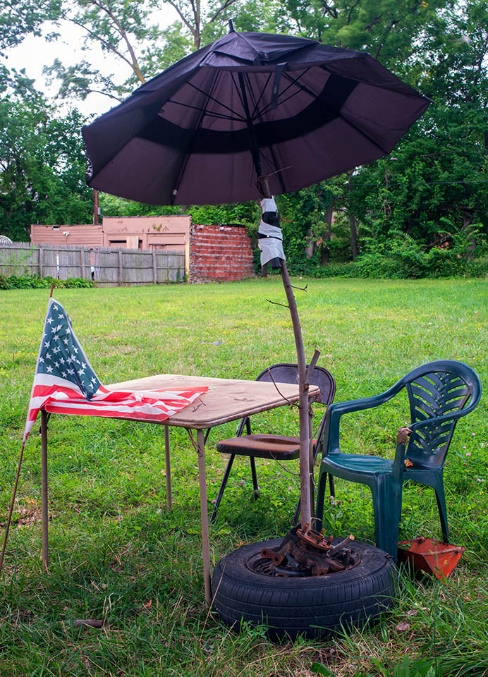 Along East 103rd Street in Cleveland, the umbrella system is made of a tree branch and various auto parts, weighted by a tire. Chairs, card table and flag round out the ensemble.