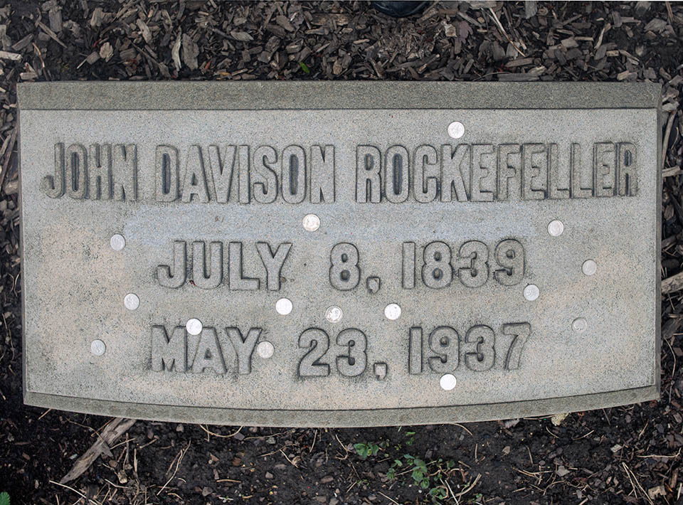 The family, with Mr. and Mrs. John D. Rockefeller in the center, are buried in a sem-circle surrounding an eighty foot obelisk. The gravestones are all the same – small and modest.