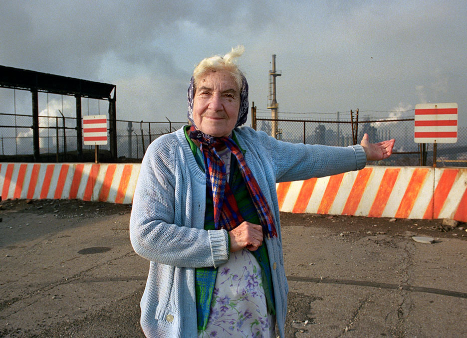 Mrs. Kocher in her backyard in 1980. Behind her is Republic Steel’s basic oxygen plant, where fresh liquid iron mixes with scrap steel and alloys to become steel. Just over her right shoulder are the old stacks from the open hearth, blooming and slab-cater plants that the BOP replaced.