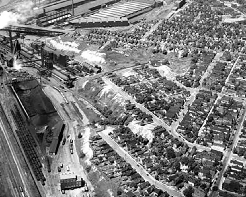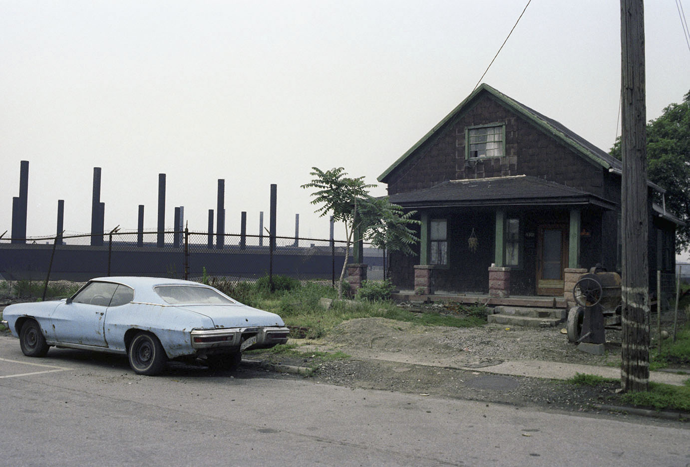 House, East 40th Place, 1989, surrounded by the Republic Steel coke plant, Pershing Avenue and the old Clark Avenue Bridge is to the right.