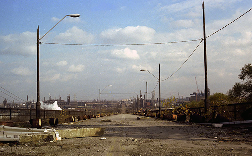 The I – 490 interchange that was supposed to be the entrance to the interstate 490 bridge over the industrial Valley, in 1980. Without the Clark Avenue Bridge, and many others, the enclaves and sub-neighborhoods of the Industrial Valley reached their peak isolation during these years.
