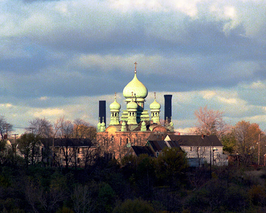 Many streets that lined the walls of the bluffs over the valley have been wiped out. Famous streets of homes close to heavy industry include St. Tikhon Street, St. Olga Street, Dille Avenue and Clarence Court, depicted in Cora Oltman’s painting of the scene behind St. Theodosius Church, on the west side bluffs of the Industrial Valley. And over on the east side bluffs, swaths of terraced streets filled with homes, and a bigger swath of neighborhood strrets to the north and east that the interstate took.