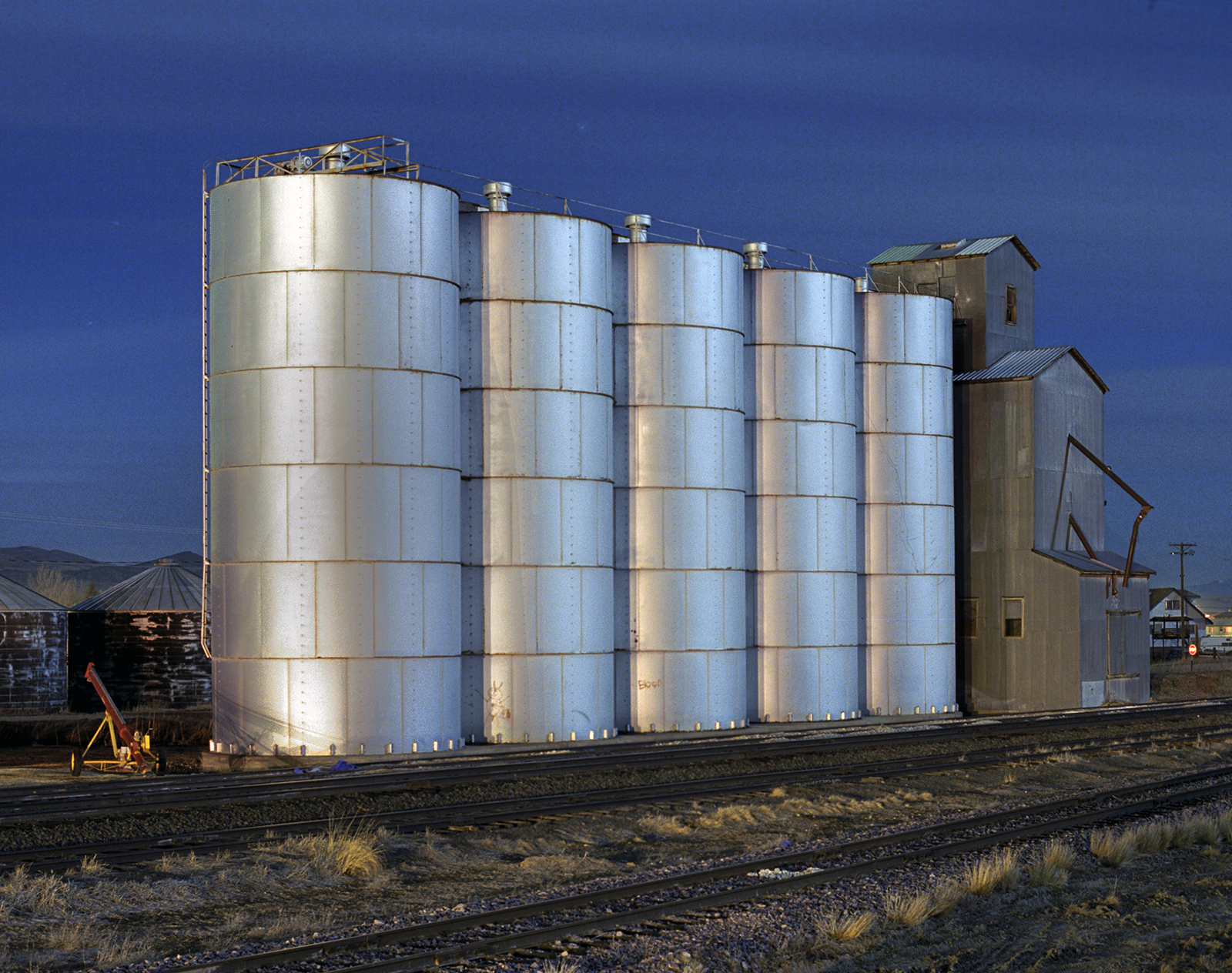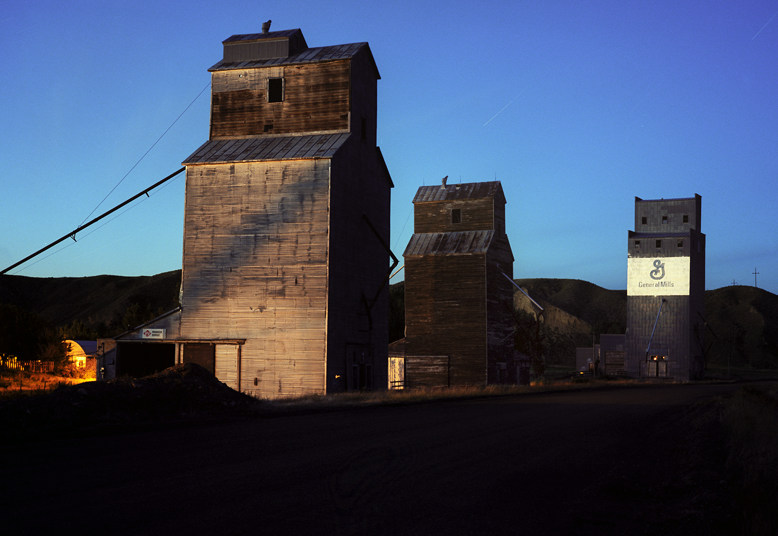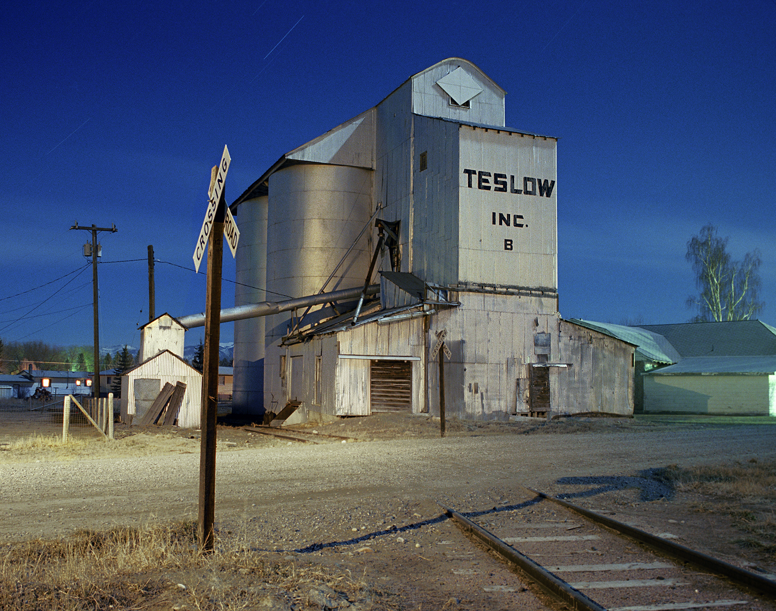 I got a chance to shoot the the Three Forks Teslow facility at the convergence of some time, place and better technicals. The late eighties was the start of the final Golden Age of Color Photography, and, it began for myself, by not shooting Kodachrome 25, but a new color negative film with the same iso and high resolution, but could handle color shifts and greatly reduce the reciprocity factor when shooting ultra-long exposures by moonlight. I was still seeing what the film could do, when I shot it in two different full moon months, at the Teslow elevators in Three Forks. Today digital has made this easy, and, thus, popular.