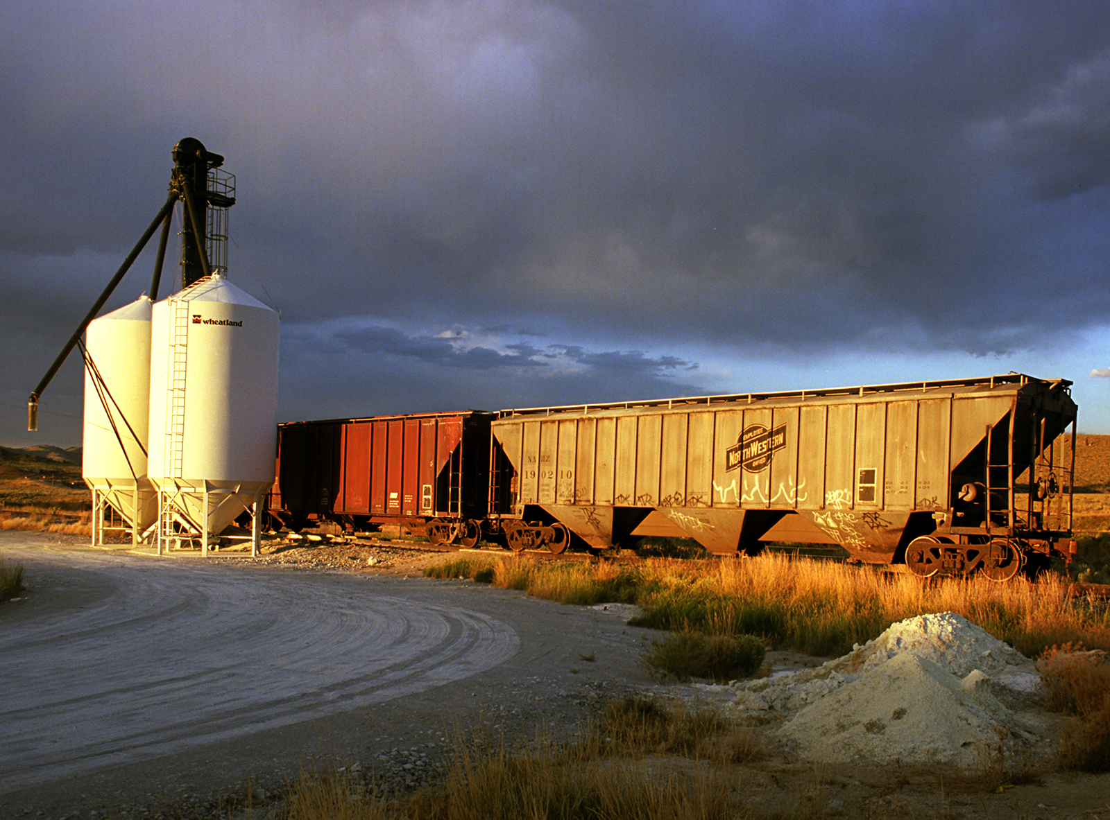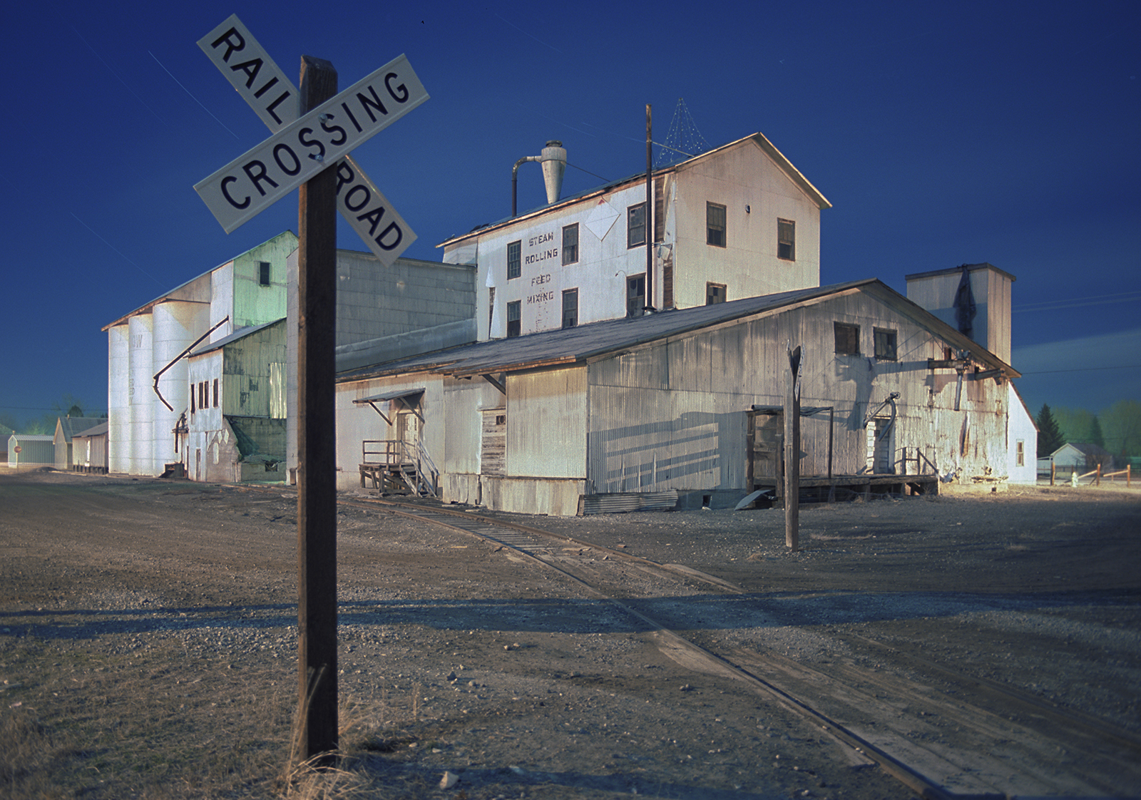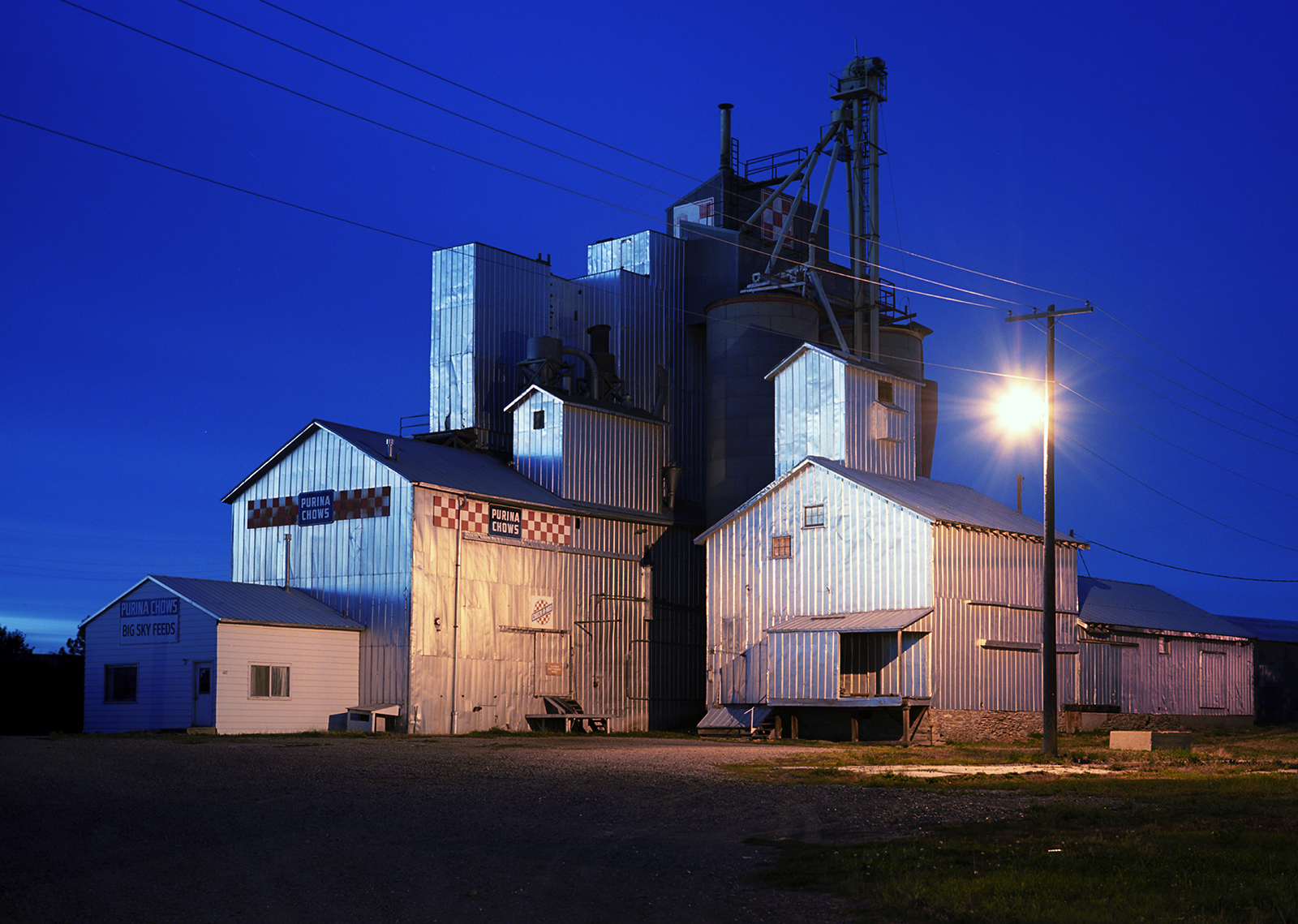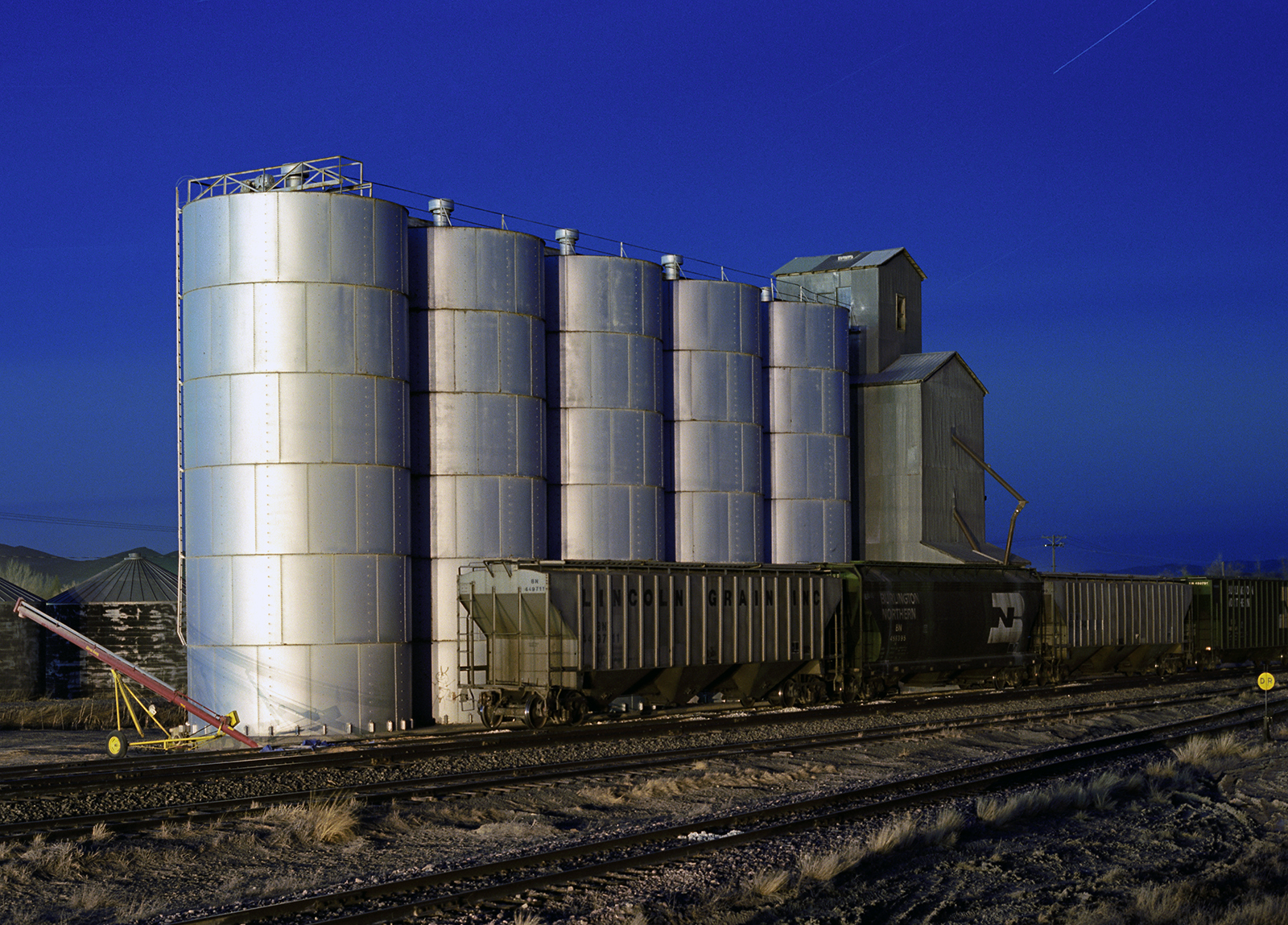 I got a chance to shoot the the Three Forks Teslow facility at the convergence of some time, place and better technicals. The late eighties was the start of the final Golden Age of Color Photography, and, it began for myself, by not shooting Kodachrome 25, but a new color negative film with the same iso and high resolution, but could handle color shifts and greatly reduce the reciprocity factor when shooting ultra-long exposures by moonlight. I was still seeing what the film could do, when I shot it in two different full moon months, at the Teslow elevators in Three Forks. Today digital has made this easy, and, thus, popular.