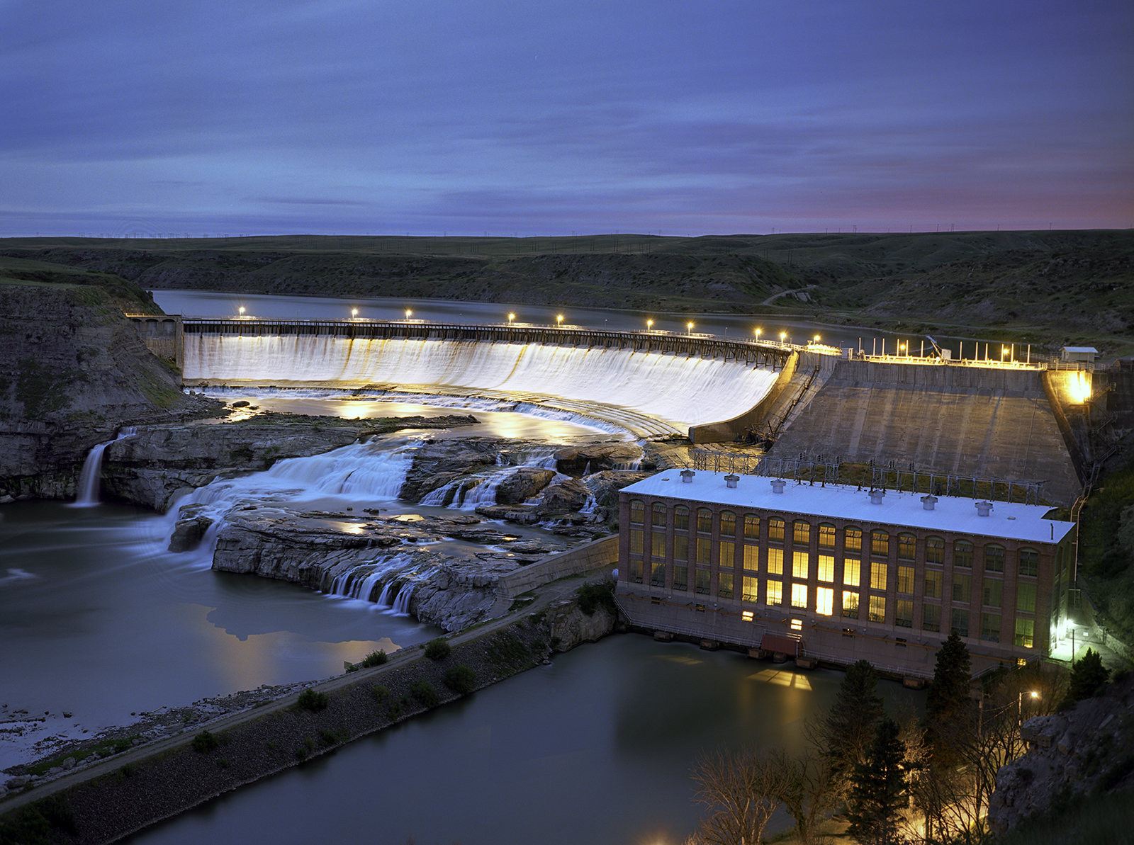 The Ryan Dam at one of the Great Falls of the Missouri River. Whether industry or homes hydro has always been a big feature of the Montana landscape, and in the vicinity of Great Falls there is the Ryan, Rainbow, Black Eagle, Moroney and the Cochrane dams that appear here on the Missouri. A dam further upriver was built to power the Anaconds Works of Great Falls.