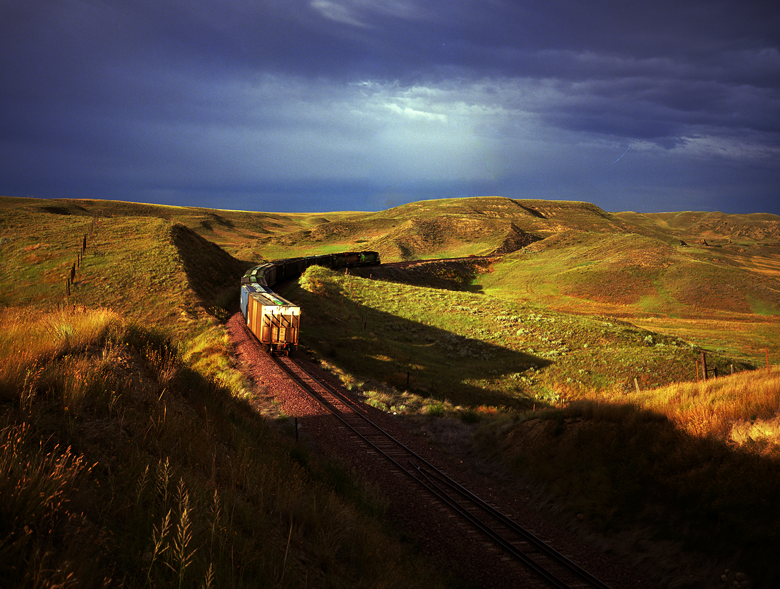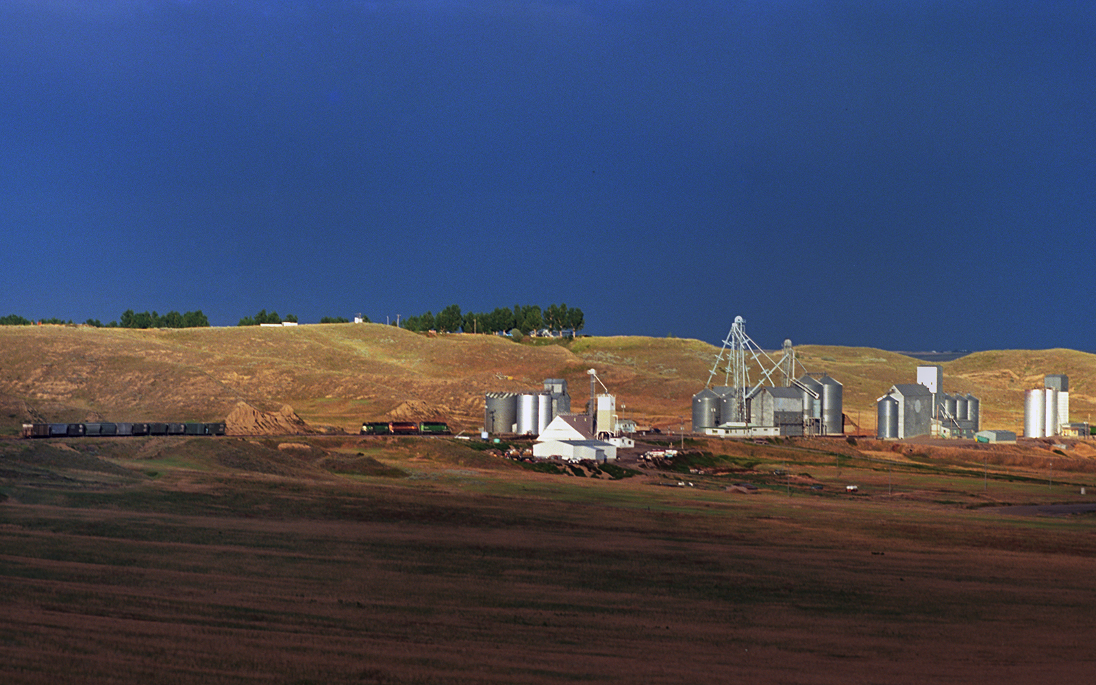 A freight train run towards the grain elevators of Fort Benton, 1995.