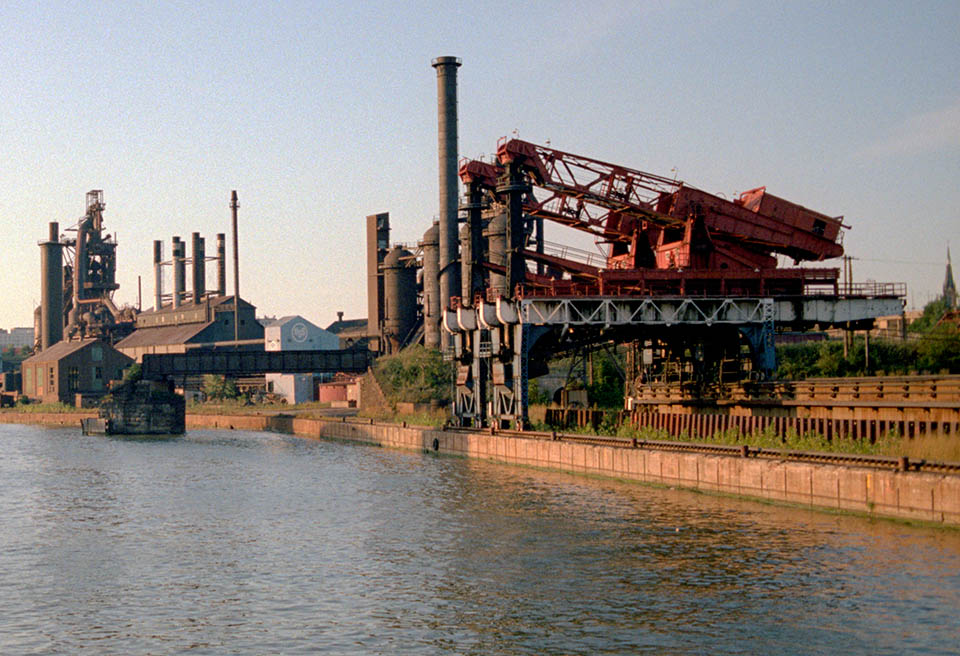 The Chicago Huletts two years after their abandonment. In the background (r.) is the LTV Coke Plant, and (l.) the Acme Steel milll, a bit upriver is seen with its unique coal/coke conveyor bridge over the Calumet iver.