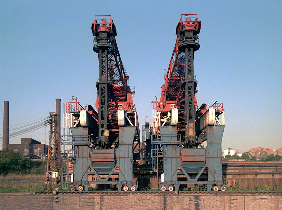 The Huletts unload coal barges along the Calumet River, as the coal bridge distributes fresh coal for storage in the coal yard for eventual conversion into coke at the plant behind the left Hulett. The large checkered tank is a gas holder on the edge of the coke plant.