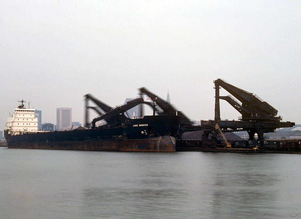The Lake Wabush being cleaned of iron ore at the old Pennsylvania Ore Docks in Cleveland in 1980. These four Huletts were big and unloded ore constantly because it fed an ore storage yard, unattached to any blast furnaces, where the ore was shipped by boat or rail to the blast furnaces, as close as, three miles away, up the Cuyahoga River.