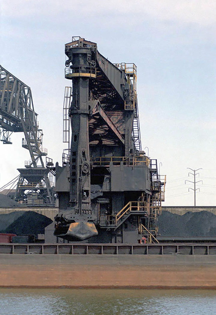 Coal is being deposited in the coal yard by an ore bridge, To the right a single hulett begins its dive into a coal barge to remove a 17 ton chunk of coal. These huletts survived so long because it was the best way to unload the barges on a river, that otherwisie utilize excavators or other mobile unloaders that take forever to unload barges.