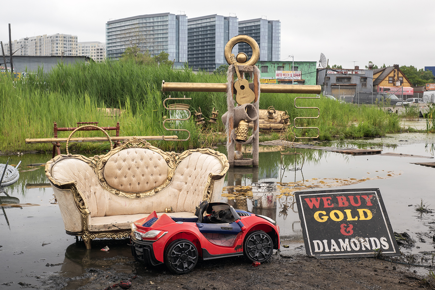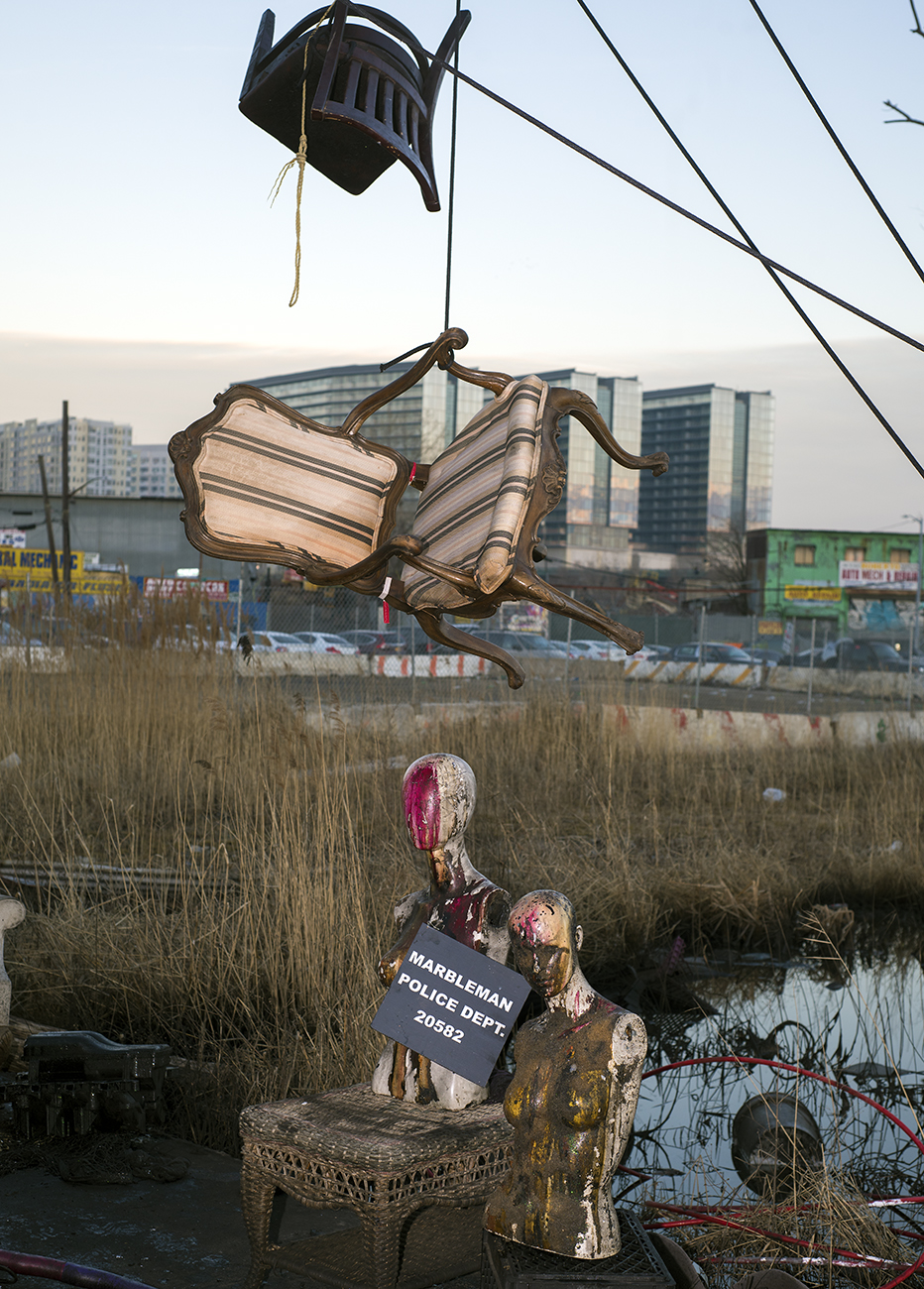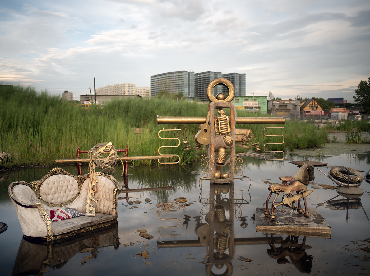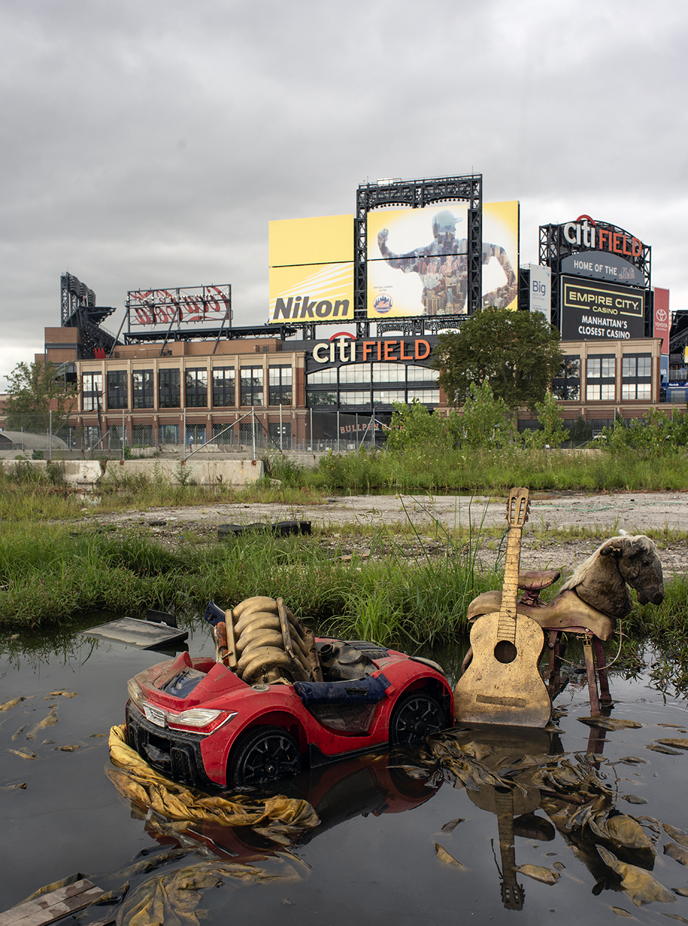 People’s nicknames in the Junkyards were the worst. Like Nacho, a notorious lover of intoxicants and a well-known long-tme junkyards worker, who actually “retired” (retirement in the junkyards is usually jail and death) from the place around the Covid time. It was love, and, compared to his history in the Iron Triangle, was the way to go, since out here time is so often limited for those on the sinking ship. One winter, Nacho, knowing my tastes, is telling me about the angels in the toxic marsh where there were recently scrapyards that were leveled for development, which turned out to be an 800 milliom dollar soccer stadium, ironiclly, displacing some of the sports biggest fans. It took three days of these stories for me to understand what he was saying. Someone had been making these pieces and constructing them on site in the middle of the Junkyards and 1.000 feet from Citi Field. The bigger surprise was the creator, Joe, who, i would meet a month later. Nacho was right. There were white flowing angels in a toxic pond where there were once slavage yards.