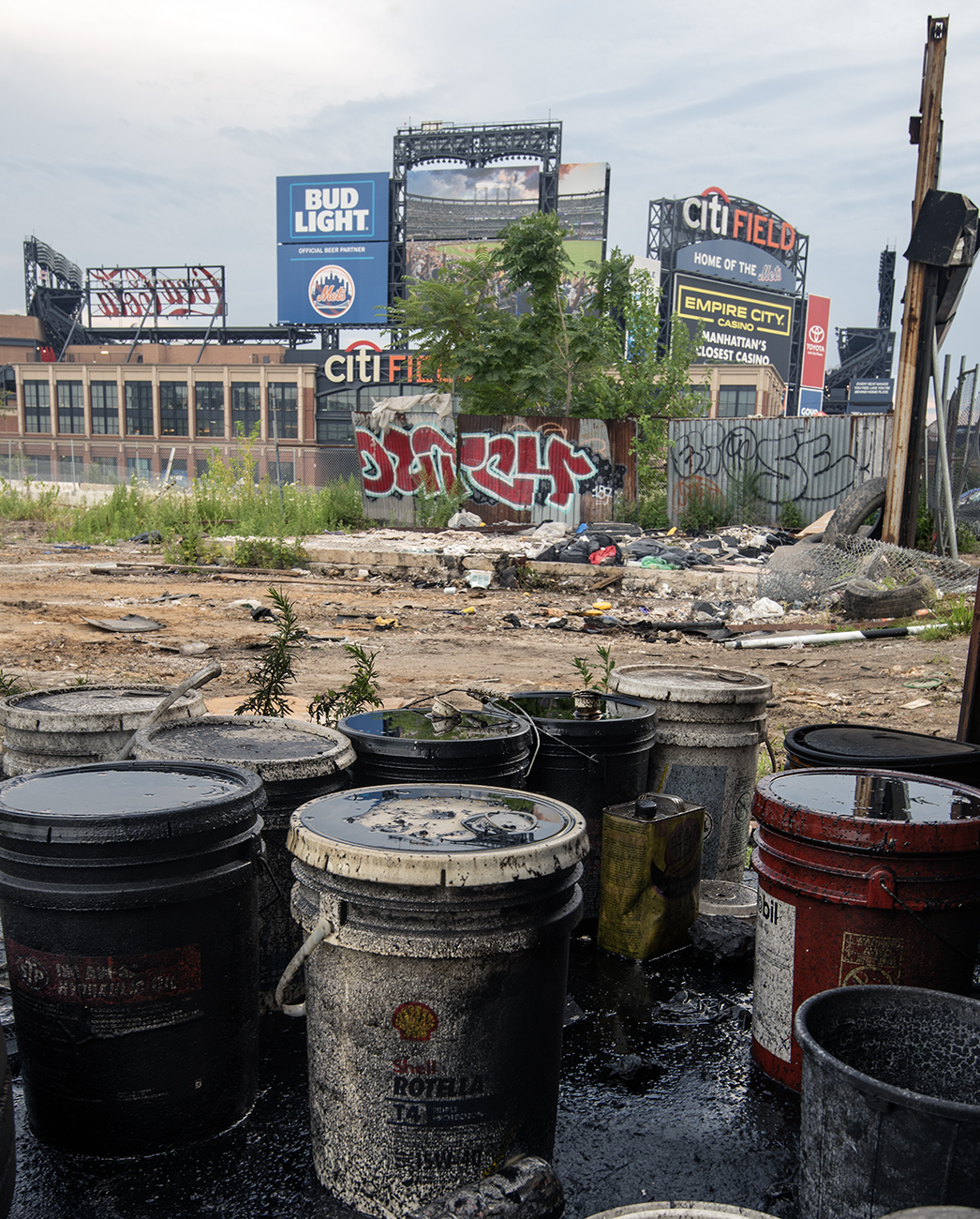 The toxic zone and marsh lay just across the street from Citi Field to the west. There was a concrete slab from a former structure, which was covered in chemicals and had numerous containers of waste chemicals. It was a place where many people would dump a kaleidescope of liquid chemicals, beginning with oil, antifreeze and all the fluids used in cars and trucks, as well as, paints, thinners, and every sort of toxic fluid. For years this was a salvage yard, one of many, where they would gut cars, like an animal in a slaughrthouse, letting all the fluids fall into the soil which is at sea level, and was a marsh before any development, the first of which was the famous dumping ground for all the coal ash from the city.
