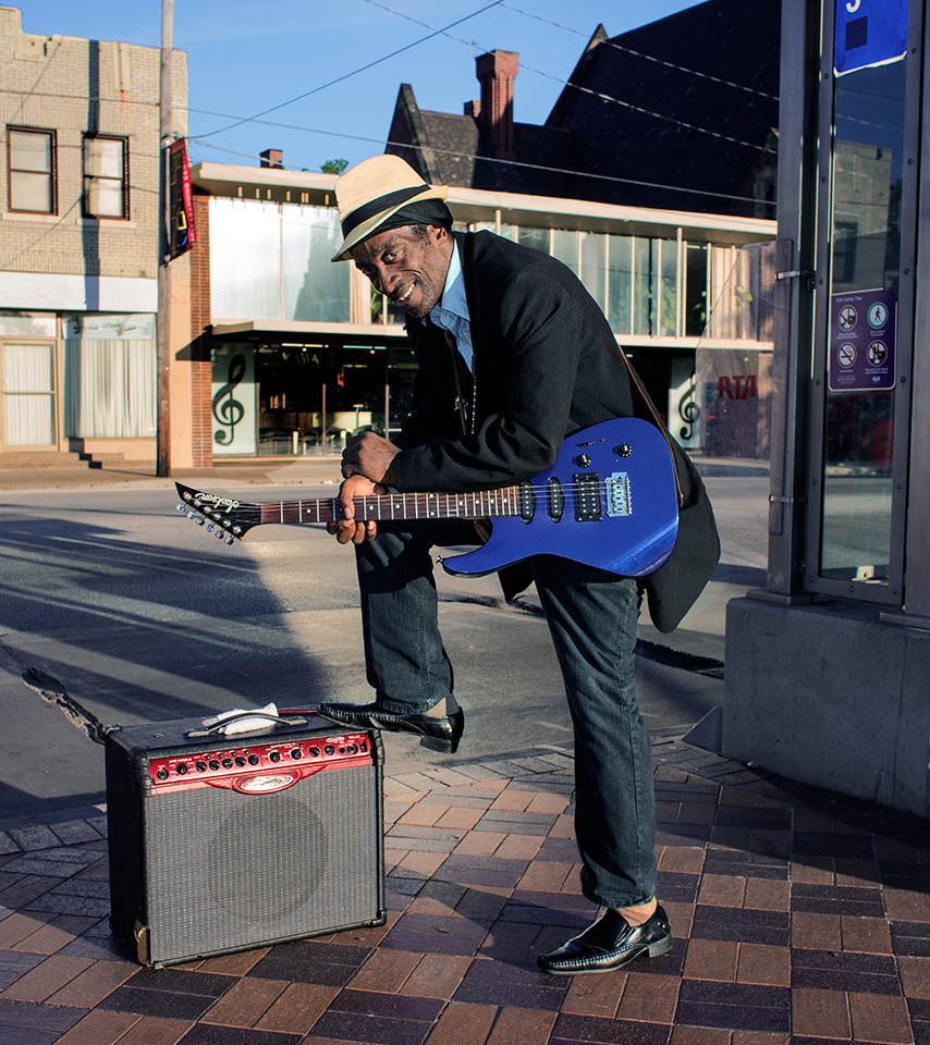 Joe Viate at a bus stop on Euclud Svenue in East Cleveland, on his way to the Wolf’s Den Strip Club and bar for his gig.